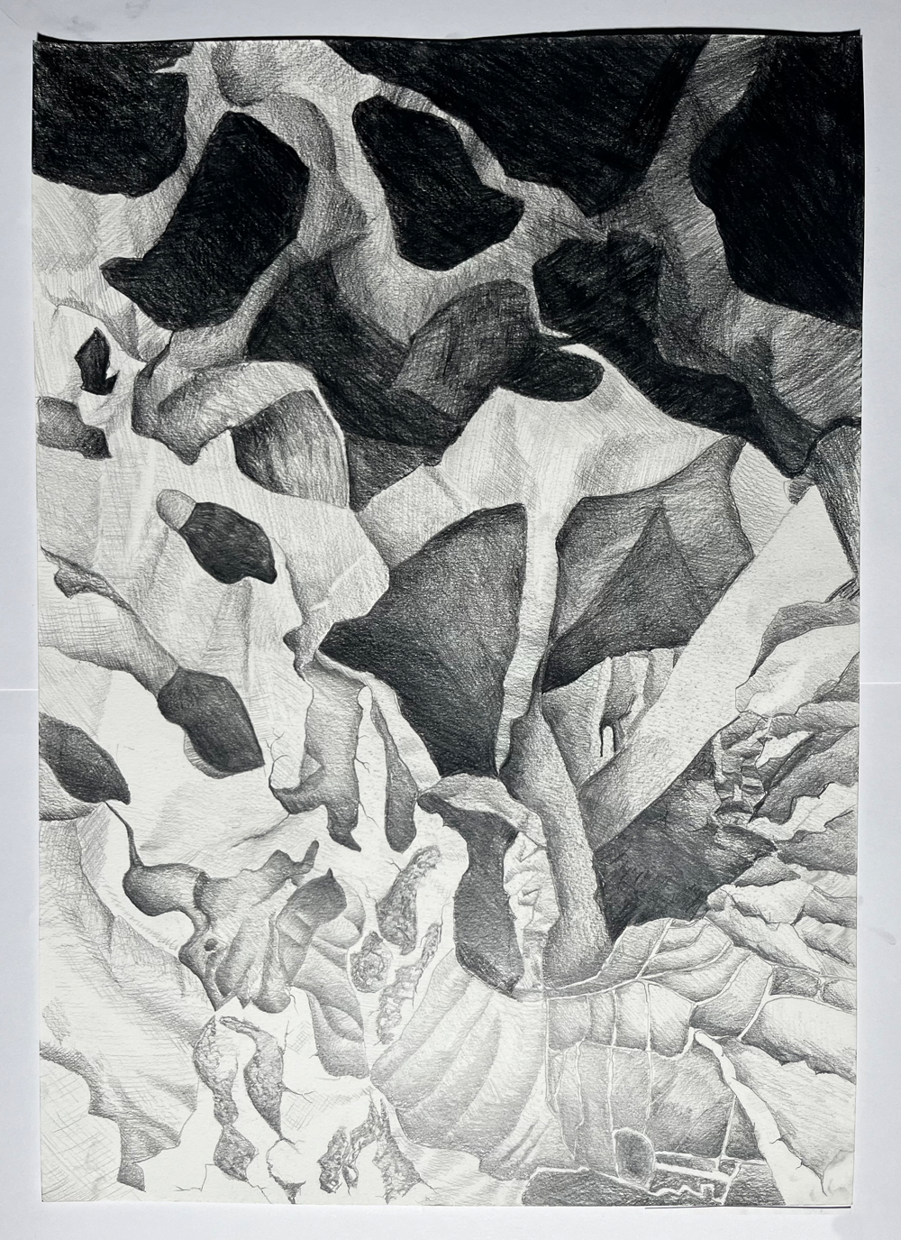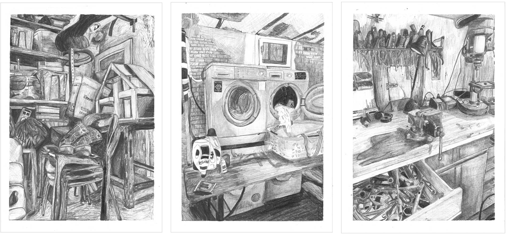 Analoge Zeichenserie, die das vollgestellte Chaos in Alltagsräumen wie Werkstätten oder Kellern festhält.