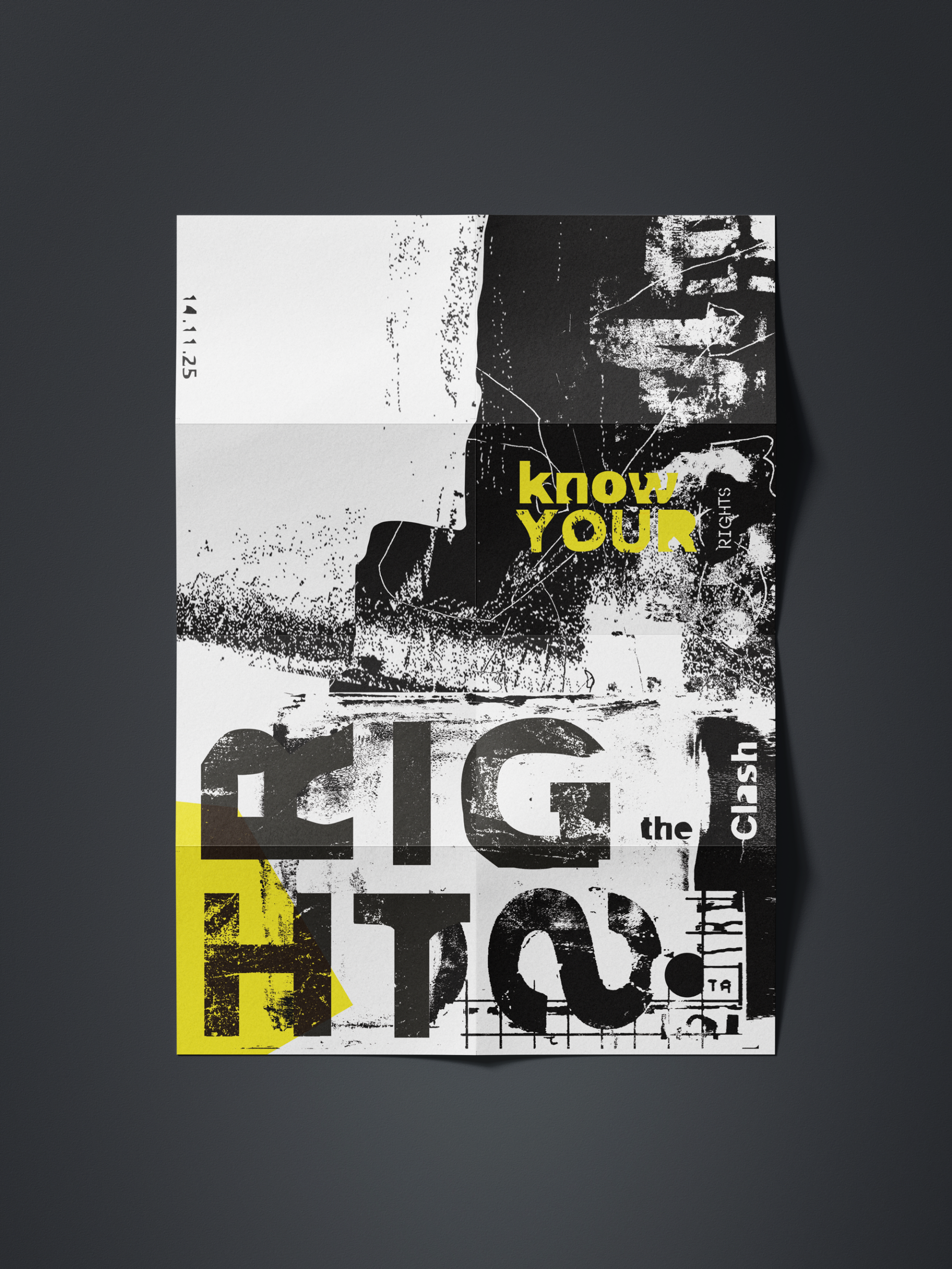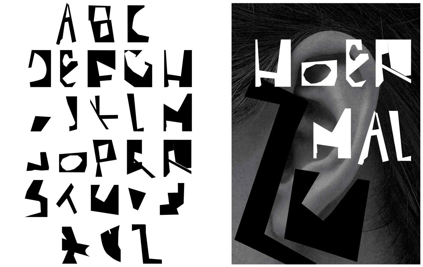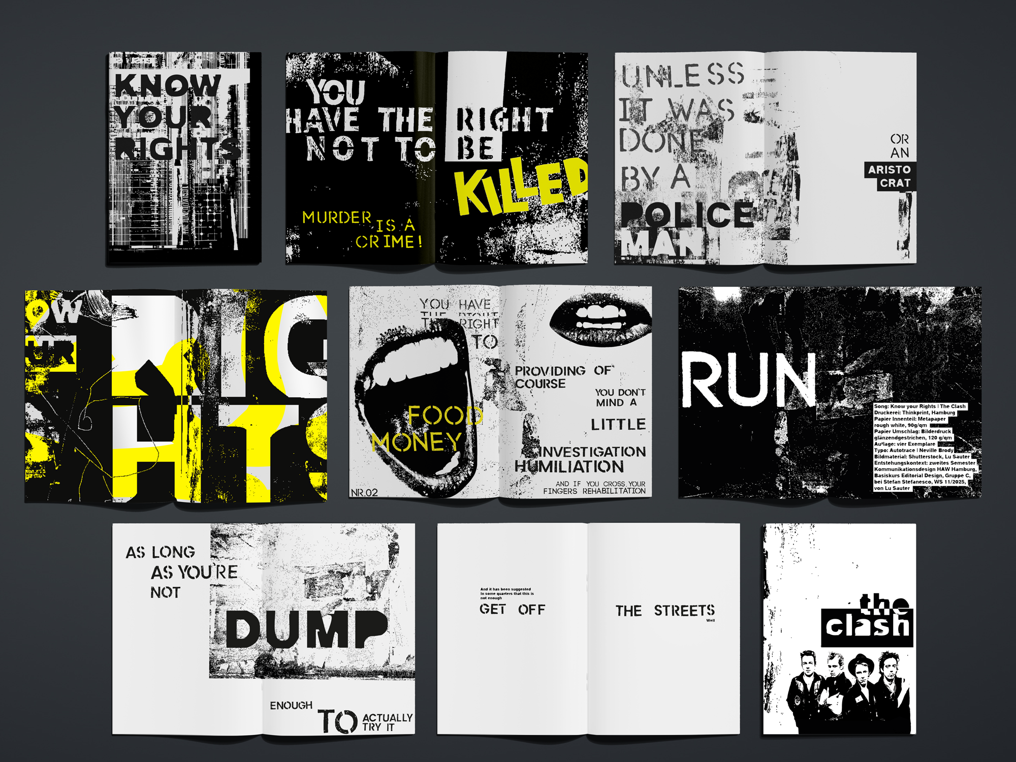 Wähle einen Song mit Text aus und gestalte basierend auf dessen Inhalt ein kleines Heft mit digitalen und analogen Elementen. Font © Neville Brody