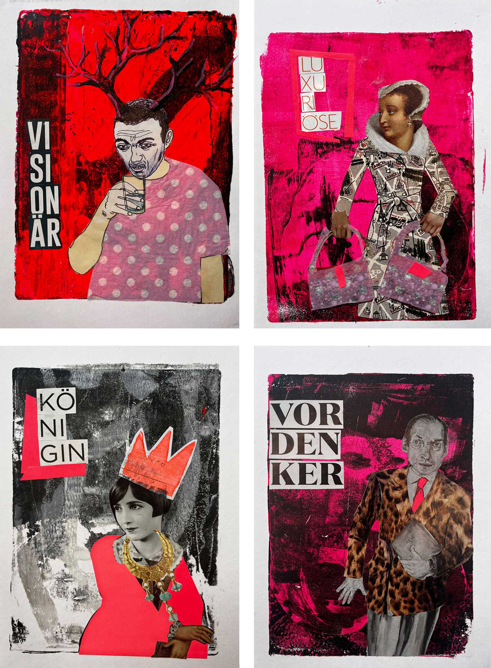 Analoge Collagen-Serie aus Zeitungsschnipseln und Farbe, die durch die Ergänzung kurzer Begriffe verschiedene Rollenbilder und Charaktere ironisch hinterfragt.